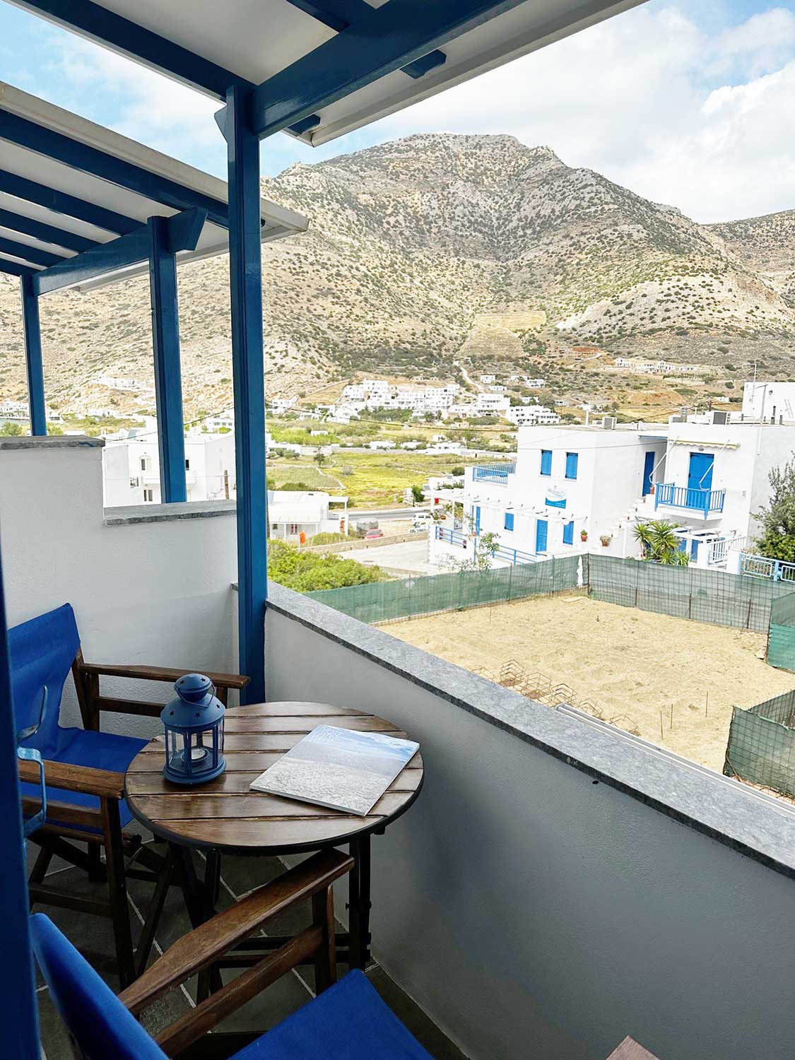 Bright and comfortable double room with a small balcony overlooking the mountain and the village of Kamares. The decoration is simple and island-style, with thoughtful details and sparkling cleanliness that stands out.