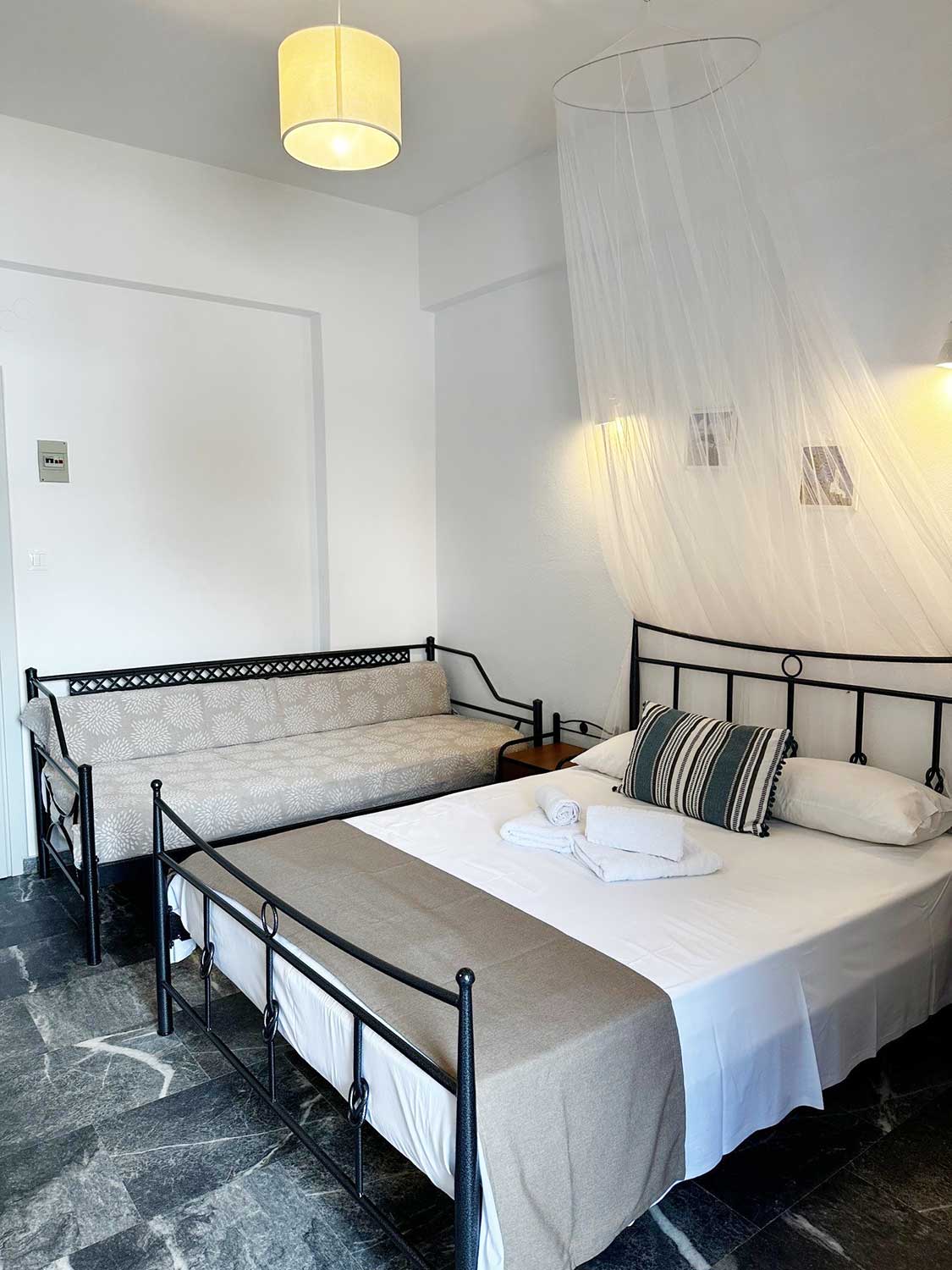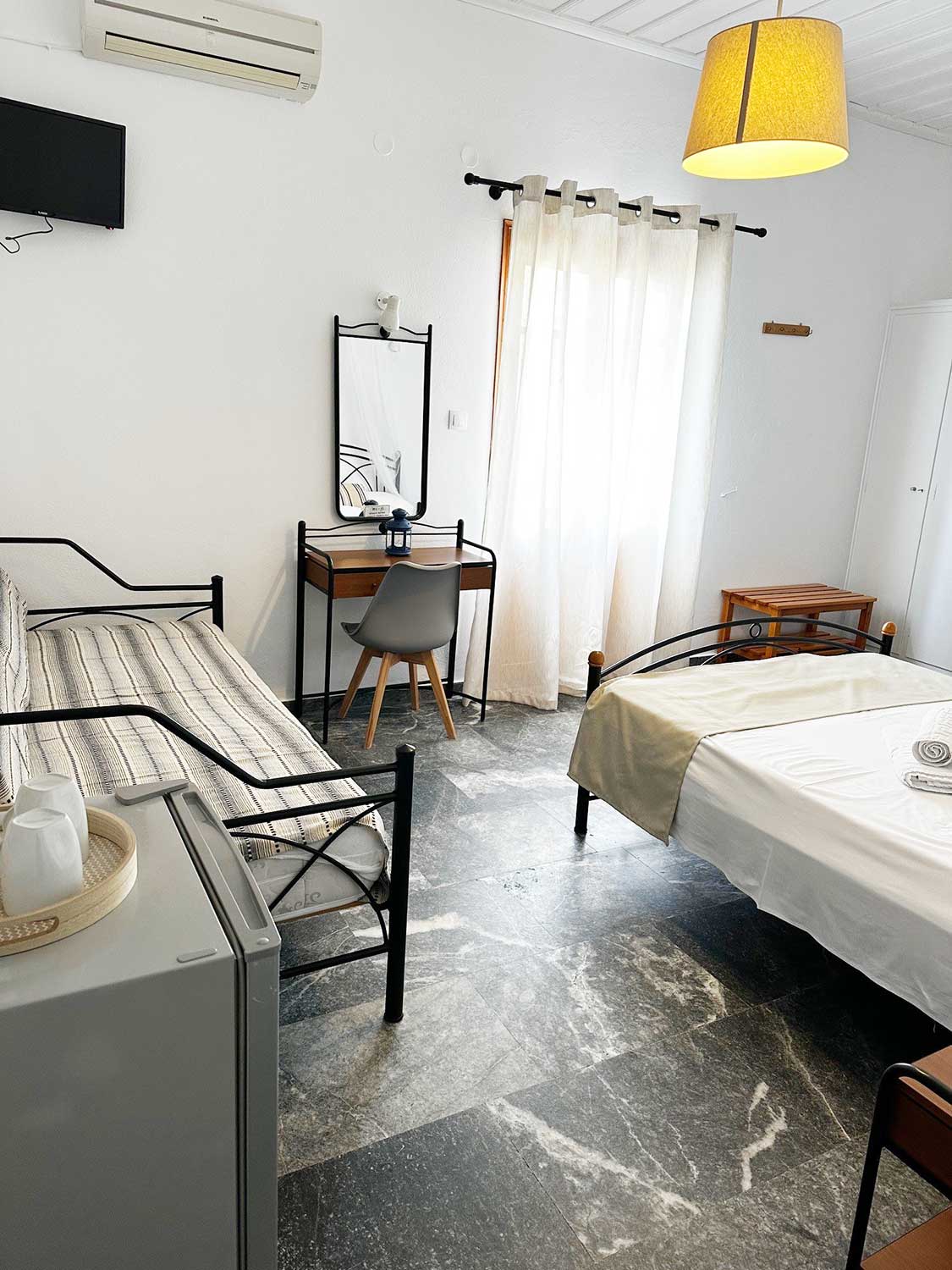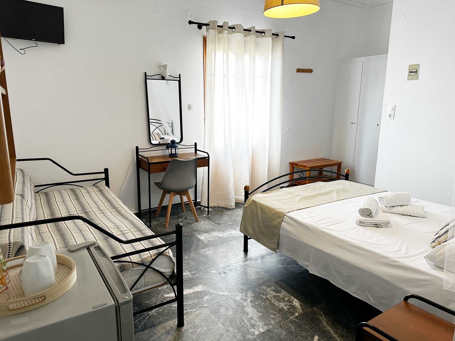 Ευρύχωρο και φωτεινό δωμάτιο που προσφέρει άνεση και θέα στο γαλάζιο των Καμαρών. Ιδανικό για μικρές οικογένειες ή φίλους, το τρίκλινο διαθέτει ένα διπλό και ένα μονό κρεβάτι, μοντέρνο μπάνιο και ευρύχωρο μπαλκόνι με μαγευτική θέα στη θάλασσα και το βουνό.