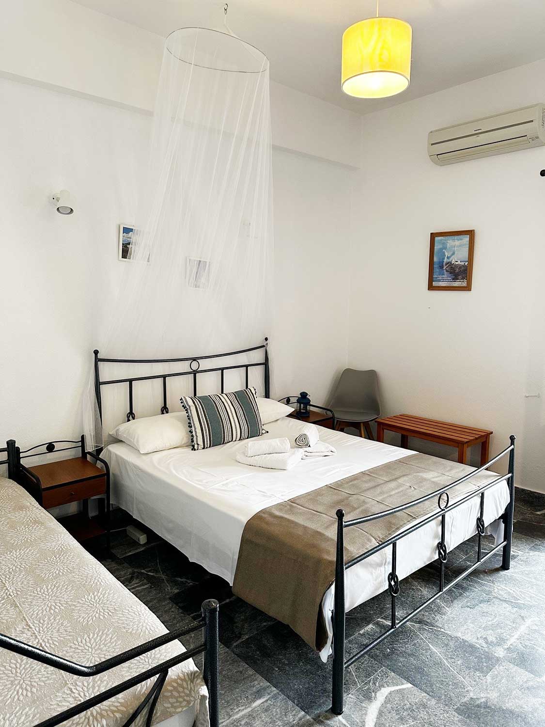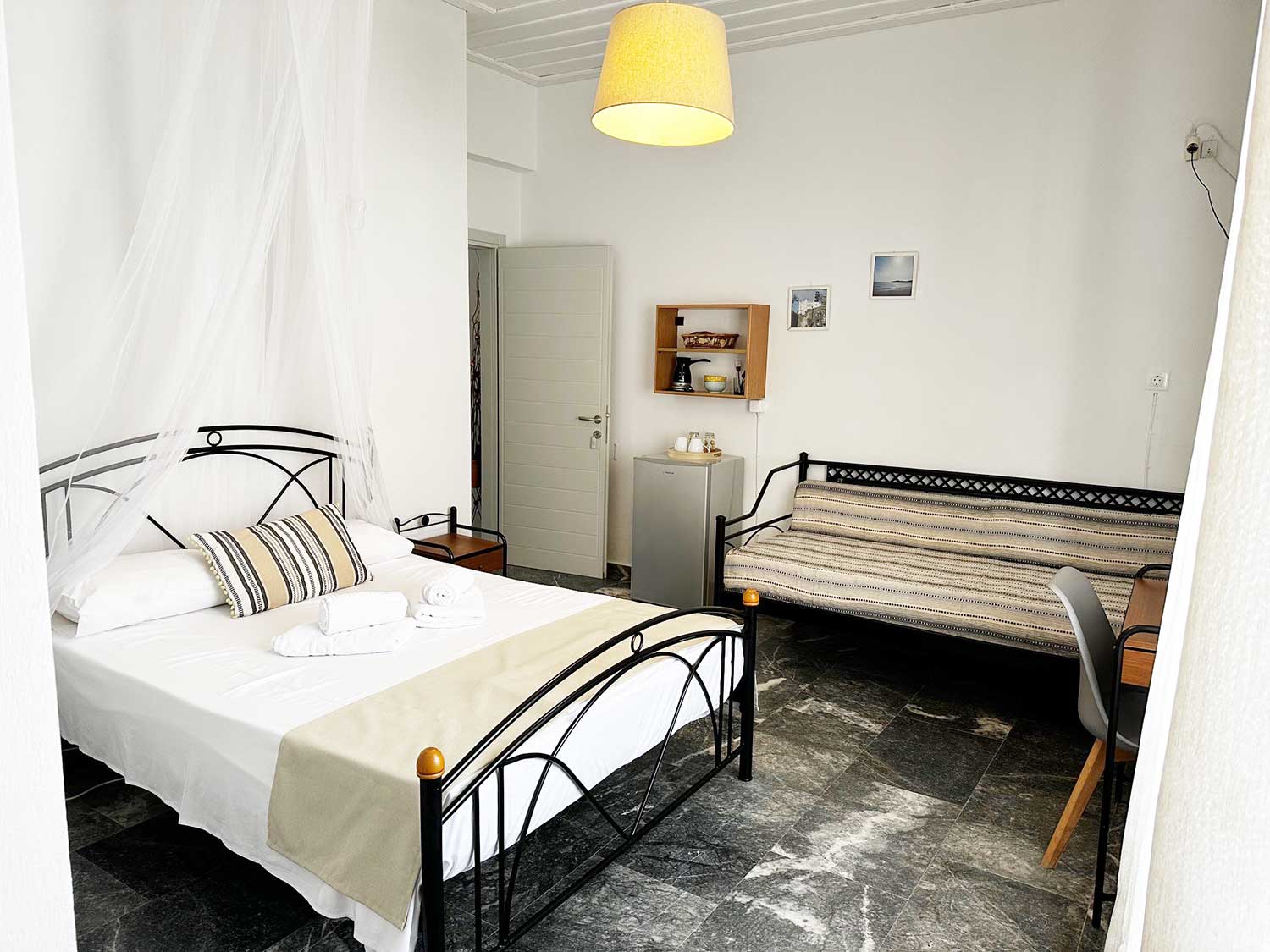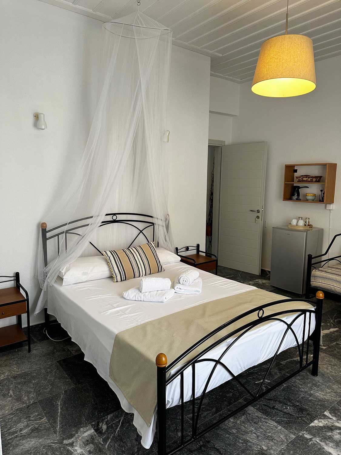 Ευρύχωρο και φωτεινό δωμάτιο που προσφέρει άνεση και θέα στο γαλάζιο των Καμαρών. Ιδανικό για μικρές οικογένειες ή φίλους, το τρίκλινο διαθέτει ένα διπλό και ένα μονό κρεβάτι, μοντέρνο μπάνιο και ευρύχωρο μπαλκόνι με μαγευτική θέα στη θάλασσα και το βουνό.